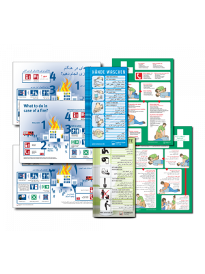 1. Mehrsprachen-Bundle bestehend aus: - je 10 Aufkleber "Handhygiene", "Toilettenhygiene" je 1 Brandschutzplakat: Deutsch, Englisch, Arabisch, Farsi 2 Plakate "Erste Hilfe"